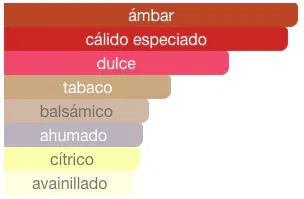 Notas de fondo: tabaco, praliné, ámbar, haba tonka, benjuí