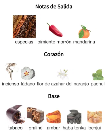 Desde el inicio, una mezcla explosiva de especias, mandarina y el toque inesperado del pimiento morrón despiertan los sentidos con energía y exotismo. En el corazón, el alma de la fragancia se torna más mística con el incienso y el ládano, envueltos por la elegancia floral de la flor de azahar y la riqueza terrosa del pachulí. El fondo es dulce, denso y adictivo: tabaco, praliné, ámbar, haba tonka y benjuí construyen una base cálida, envolvente y duradera que deja una estela inolvidable.